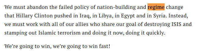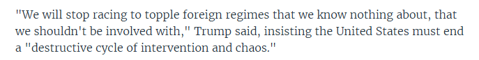 On July 21, 2016, when he received the GOP nomination, the orange conman pedophile denounced “regime change” wars: