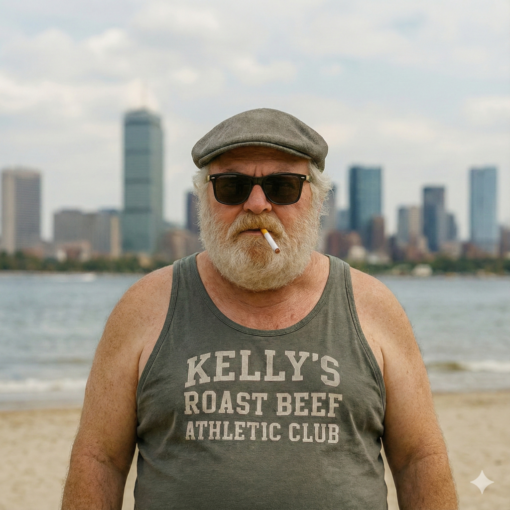 His look is part Southie cryptid, part beachside burnout, part escaped barstool prophet: scally cap, dark sunglasses, scruffy white beard, stained Revere Beach shirt, cigarette hanging on for dear life. He has the energy of a man who might spend three hours “modifying” a radio with a butter knife, then blame global elites when the smoke comes out.
