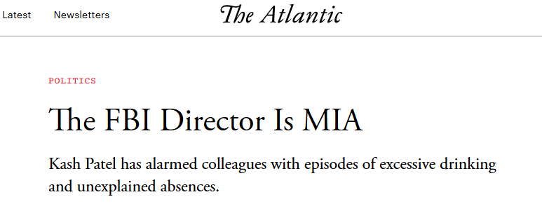 This week the excellent journalists at The Atlantic blew the lid wide open on Krazy Kash Patel’s absolutely insane alcoholic benders behind the wheel of the FBI.
